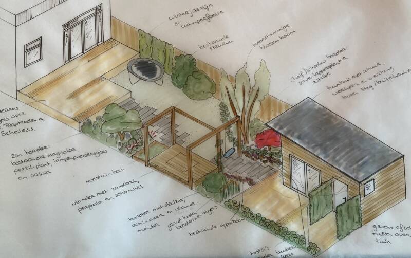 Groen, groener, groenst was de wens van deze bewoners! Niet teveel kleurrijke beplanting, wel boordevol groen, natuurlijke materialen en een zo natuurlijke mogelijke manier om de heetste zomerzon uit de woonkamer te weren. Oh ja, en hun enthousiaste hond moest binnen de tuin gehouden kunnen worden, zonder het gevoel te krijgen dat de tuin vergrendeld en afgesloten was.