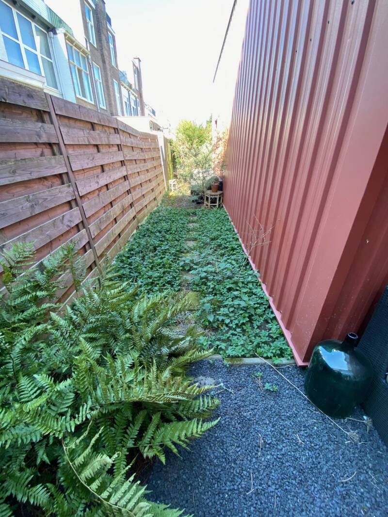 De tuin van dit winkelpand stond vól met zevenblad en woekerende braamstruiken. En hoewel de focus van de winkel niet naar buiten ligt - en er naast het drukke winkelleven niet veel tijd overblijft om veel te tuinieren - wilde de eigenaresse toch een manier vinden om dit achtertuintje er iets aantrekkelijker uit te laten zien. Mijn advies was onder meer om het zevenblad er één keer zo volledig mogelijk uit te trekken, met wortelstok en al. Vervolgens adviseerde ik om Ooievaarsbek (Geranium 'rozanne') te planten. Niet alleen bloeit deze variant extreem lang met mooie paarse bloemen, de plant vraagt ook nog eens bijzonder weinig onderhoud. Daarnaast groeit hij in mooie, volle pollen, waardoor het zevenblad geen zonlicht meer krijgt en onderdrukt wordt.
